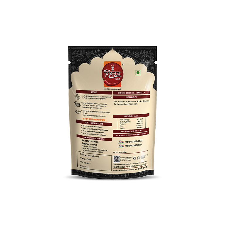 Shindraj Chicken 65 Masala helps you make tasty, spicy chicken 65 at home — just like the one you get at restaurants or roadside stalls. This chicken 65 masala powder is made with a mix of hand-roasted Indian spices like red chilli, cumin, garlic, and black pepper that give your dish the right colour, crunch, and taste.