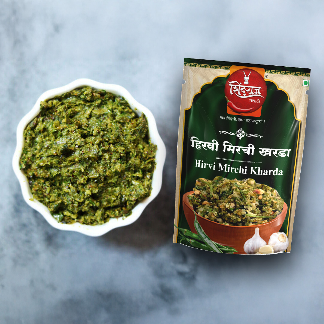 Shindraj Hirvi Mirchi Kharda is a fiery green chutney made with crushed green chillies, garlic, jeera, and a touch of salt ground in traditional style for that rustic homemade punch. This green chilli kharda chutney is perfect for those who like their meals with a spicy twist.