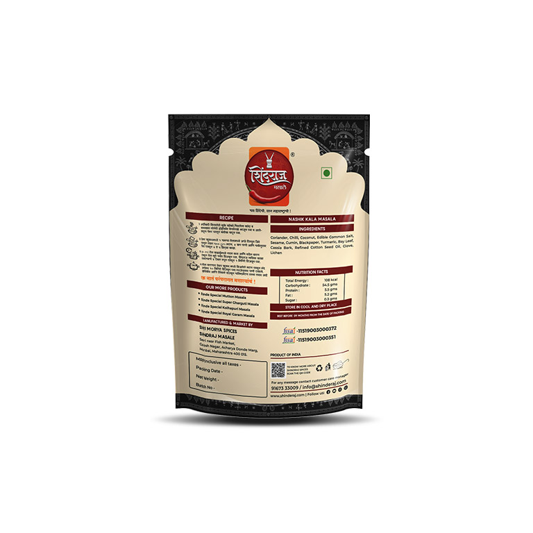 Shindraj Nashik Kala Masala is a traditional, slow-roasted blend of spices known for its rich, earthy flavour and smoky aroma. Made using black sesame, dry coconut, cloves, bay leaves, stone flower, and more, this Kala Masala powder brings a unique twist to everyday curries, dals, and sabzis.
