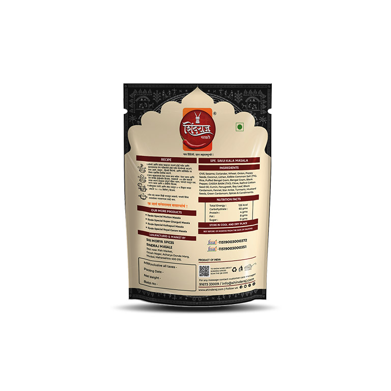 Shindraj Saoji Kala Masala is crafted for spice lovers who enjoy the rich, deep, and unmistakable flavour of authentic Saoji-style curries from Nagpur. This Kala Masala is roasted till perfectly dark and blended with strong spices like black pepper, dry coconut, dagad phool, cloves, cinnamon, and poppy seeds, giving your curry that signature spicy and smoky flavour.