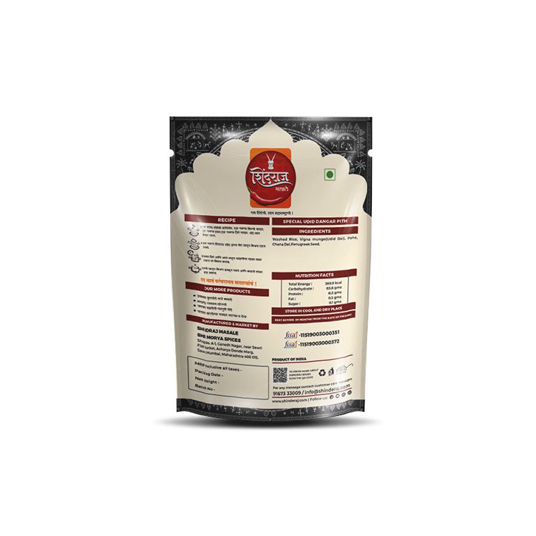 Shindraj Udith Dangar Pith is made from finely ground roasted urad dal, a pantry staple in every traditional Maharashtrian home. Whether you’re making kachori, vade, chakli, or using it to thicken gravies, this urad dal flour gives the right crisp, texture, and aroma.
